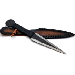 The double sided blade of the Assassins Creed Brotherhood is sharpened for absolute piercing effect. Each blade is a single solid, full tang piece, crafted from Stainless Steel. It features the symbolic print from the game and story. The edges on both sides of each knife are sharpened, and the point is great for piercing. Overall Length: 5.9 Inches. Blade Length: 3.2 Inches. Blade: Stainless Steel, Double Sided, Sharp. Blade Thickness: 2.4mm. Handle: Solid Piece, Full Tang. Features: Black Print, Assassins Creed Insignia.