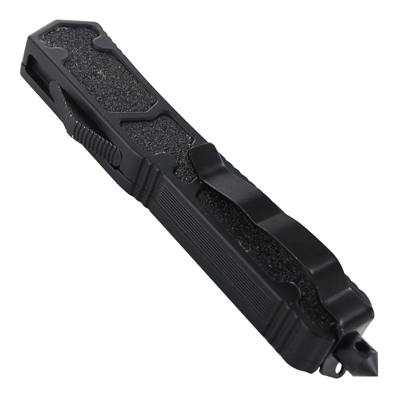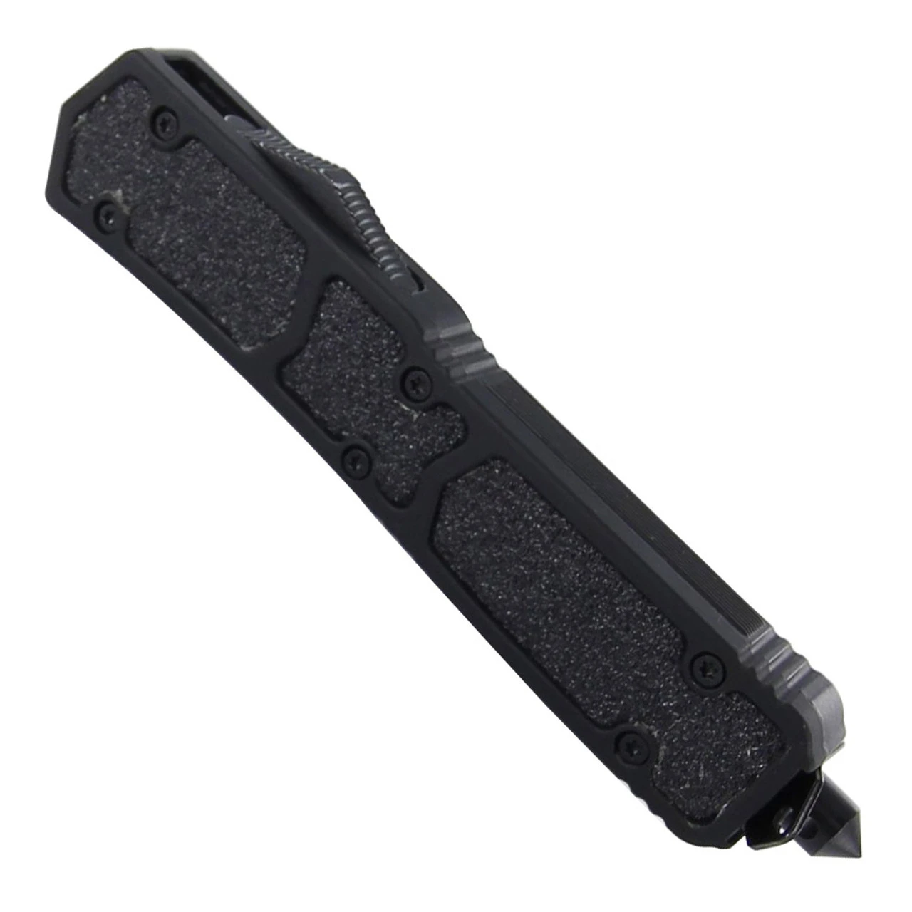 This astounding blade is made from stainless steel in a tanto style.The dual action is a fantastic feature to have and cuts down on reaction time. Just slide the thumb slide back and forth.The handle casing is zinc alloy with sand paper inserts for working in wet conditions. A glass breaker is featured end of the handle with a steel pocket clip.This beauty comes with a quick release nylon sheath too.Overall Length: 8.50 Inches.