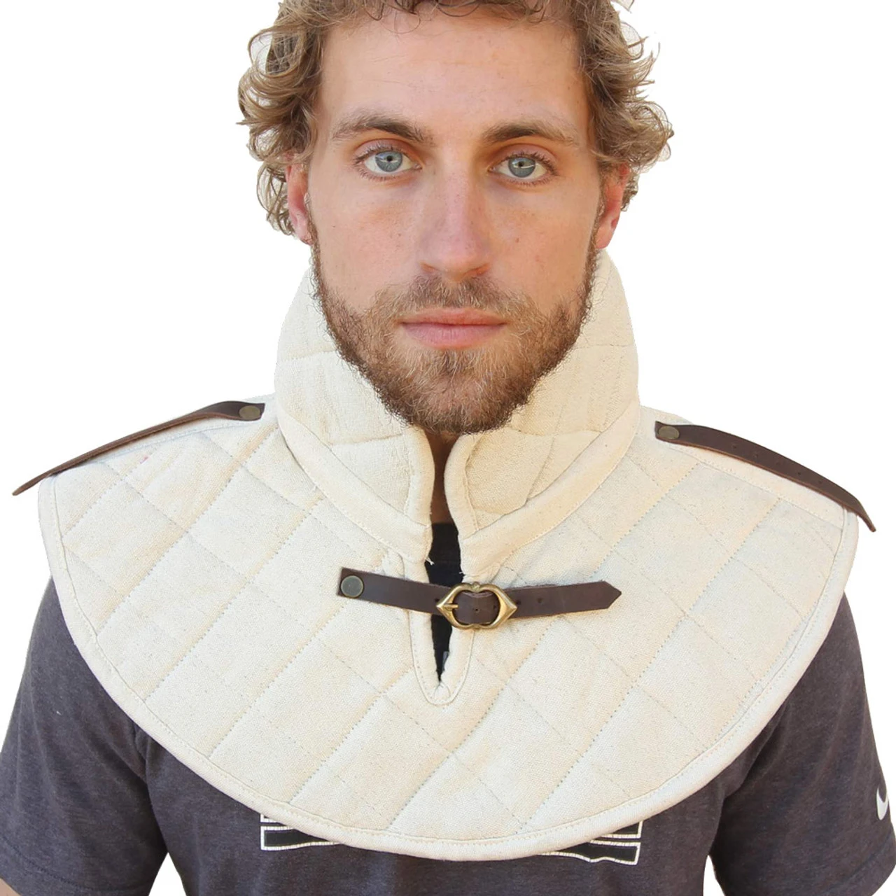 Padded garments like this Cotton Collar are worn underneath metal and chain mail armor. It improves the absorption of impact and reinforces coverage. This armor padding is made of 100% cotton and uses compressed and layered cotton padding.This unit features hard, durable stitching and a thick, layered trim piece. 4 Inches of cotton padding protect the neck. Leather armor supports are located on the shoulders. An adjustable strap fits adult sizes. Comes in black or white.