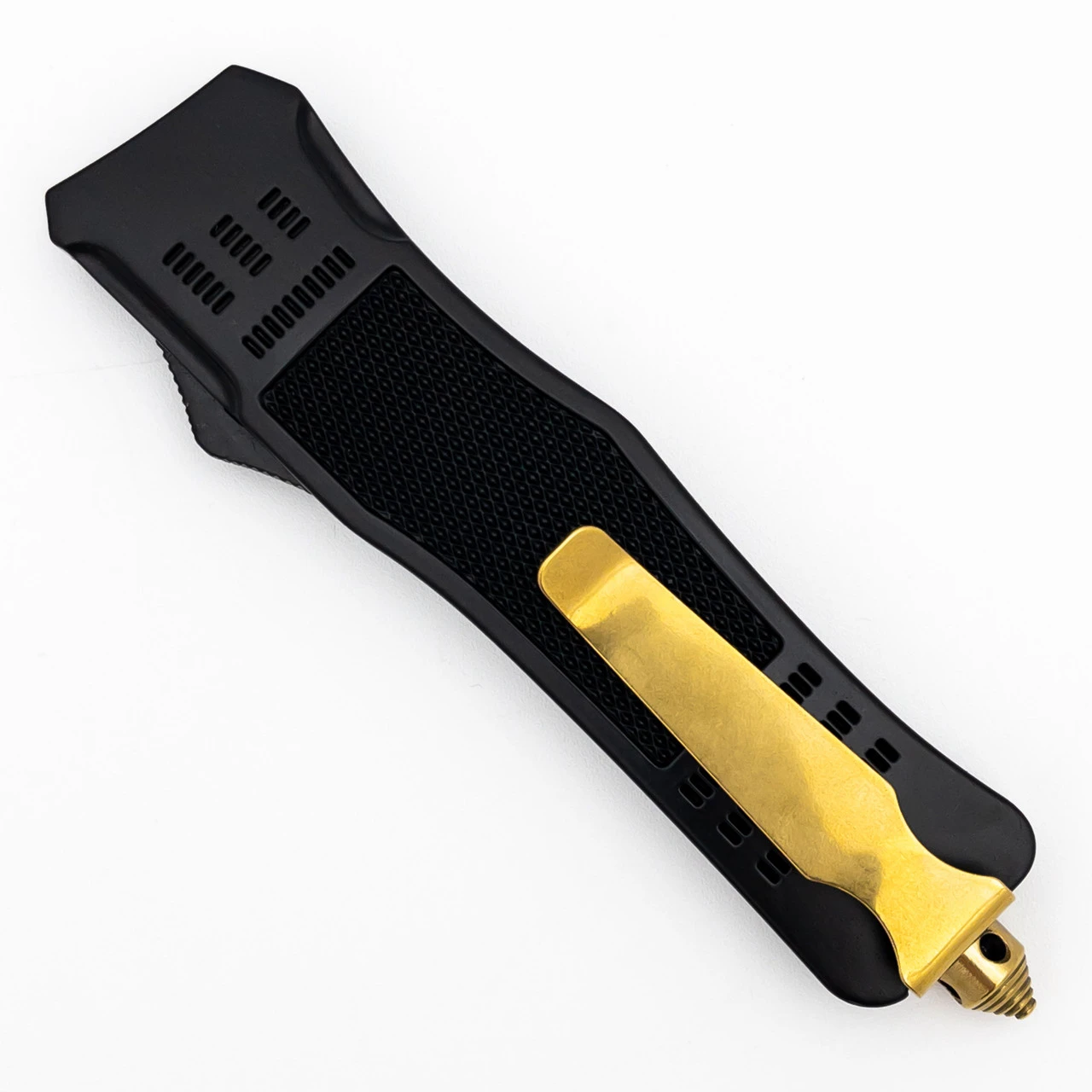 The first thing that draws your eyes to this exquisite OTF knife is the massive zinc aluminum handle. This knife was constructed with a large grip in mind. The diamond textured pattern on the handle allows for a solid grip that won’t slip even in rough weather conditions. This out the front knife is dual action, meaning you can eject and retract the blade with just the push of the switch located on the side of the handle. Easy Peasy! The attractive blade is constructed of stainless steel with a sleek golden finish that has been carefully laser etched with a gorgeous feather-like design. Sporting gold-toned hardware including a steel pocket clip and emergency glass breaker, this knife a functional work of art. Included with your knife is a deluxe nylon sheath with belt loop and buckle closure. Overall Length: 9.5 inch, Blade Length: 3.75 inch