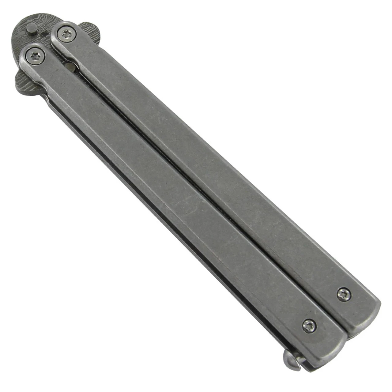 The smooth sleek design paired with a Damascus blade gives this knife an intriguing look. The handle is double walled with a steel frame and a stonewash finish. The bite handle features a safety latch for locking the blade open and closed. This tanto point blade is Damascus steel made from 1095/15N20 Alloy Steel. There are 176 Blade layers that have been tempered at around 54 to 55. The twist pattern used to create this blade has impeccable craftsmanship. This knife is built solid and you can tell just by the sheer weight of it. Built to last and looks great, what more could you want? Overall Length: 8.75 Inches.