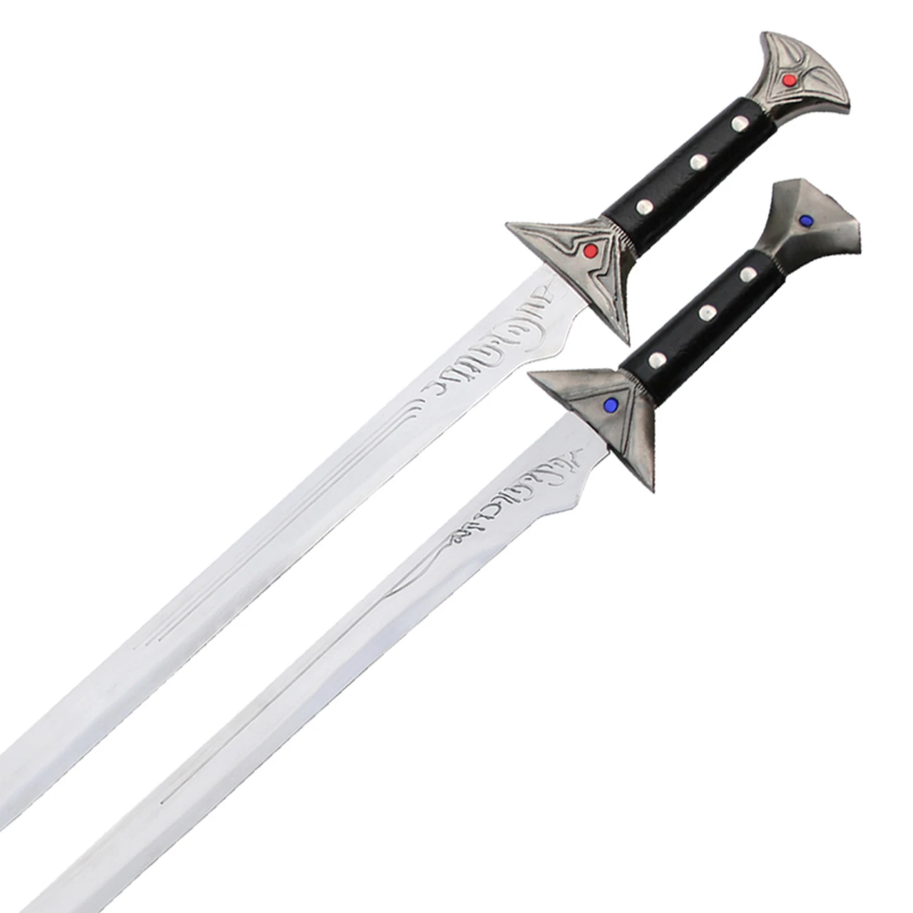 Feature a full stainless steel pommel and guard with a black leather studded to the handle. Each of the swords comes with its own color gem, one red and one blue. Both guards and pommel also share different shapes and designs. The blade comes 440 mirror polish stainless steel with different engravings and is factory sharp. The Icing death and Twinkle Scimitar sword comes complete with two genuine black leather sheaths with belt loop.