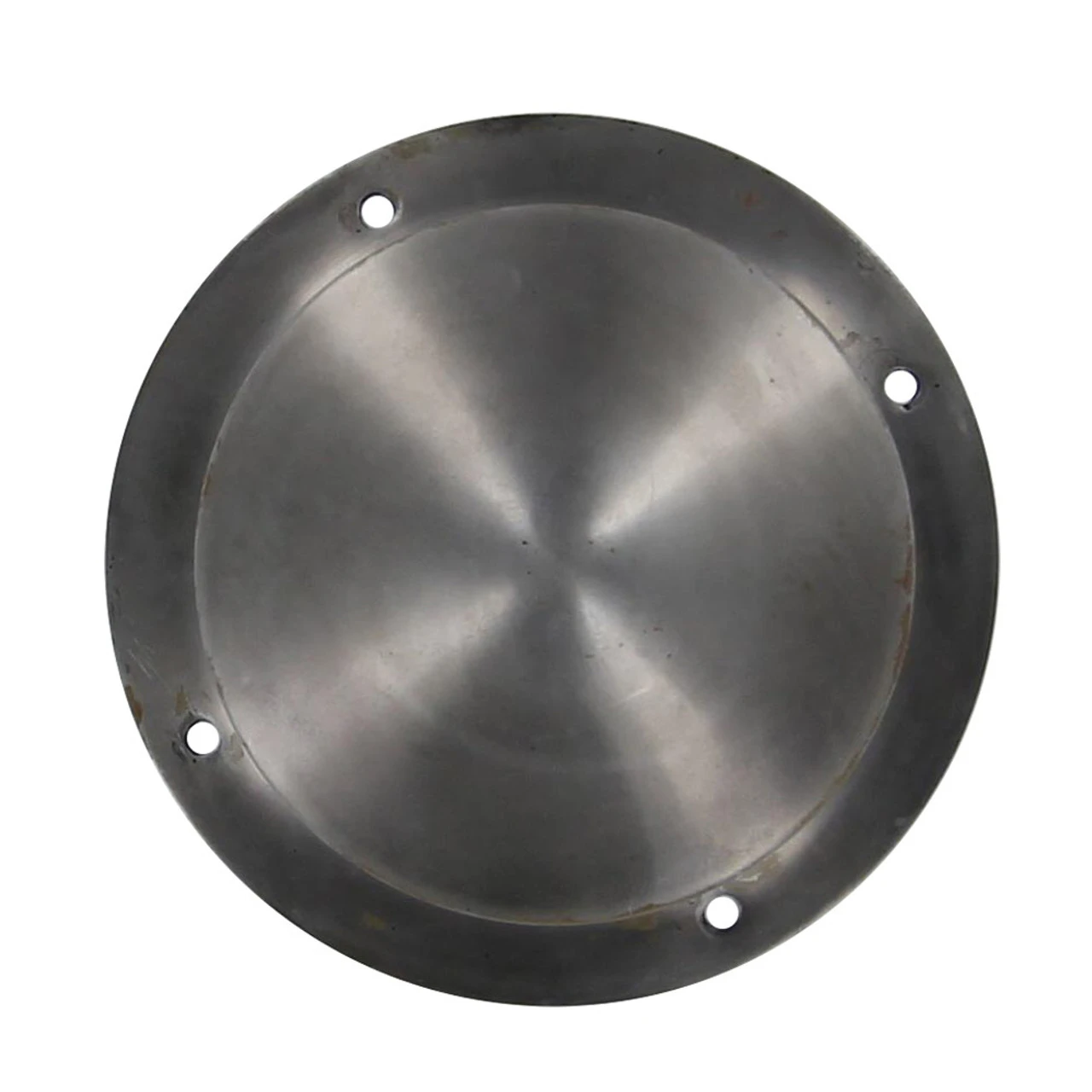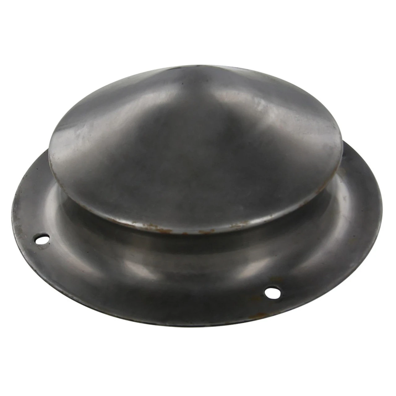 This conical piece is made from 16 gauge iron with four holes for mounting. Provided is a mounting set of rivets and washers. The gray finish gives this umbo a sign of age just like it came right from that period. Outer Rim Dimensions: 6.50 x 6.50 Inches. Backside Inner Dimensions: 4.50 x 4.50 Inches.