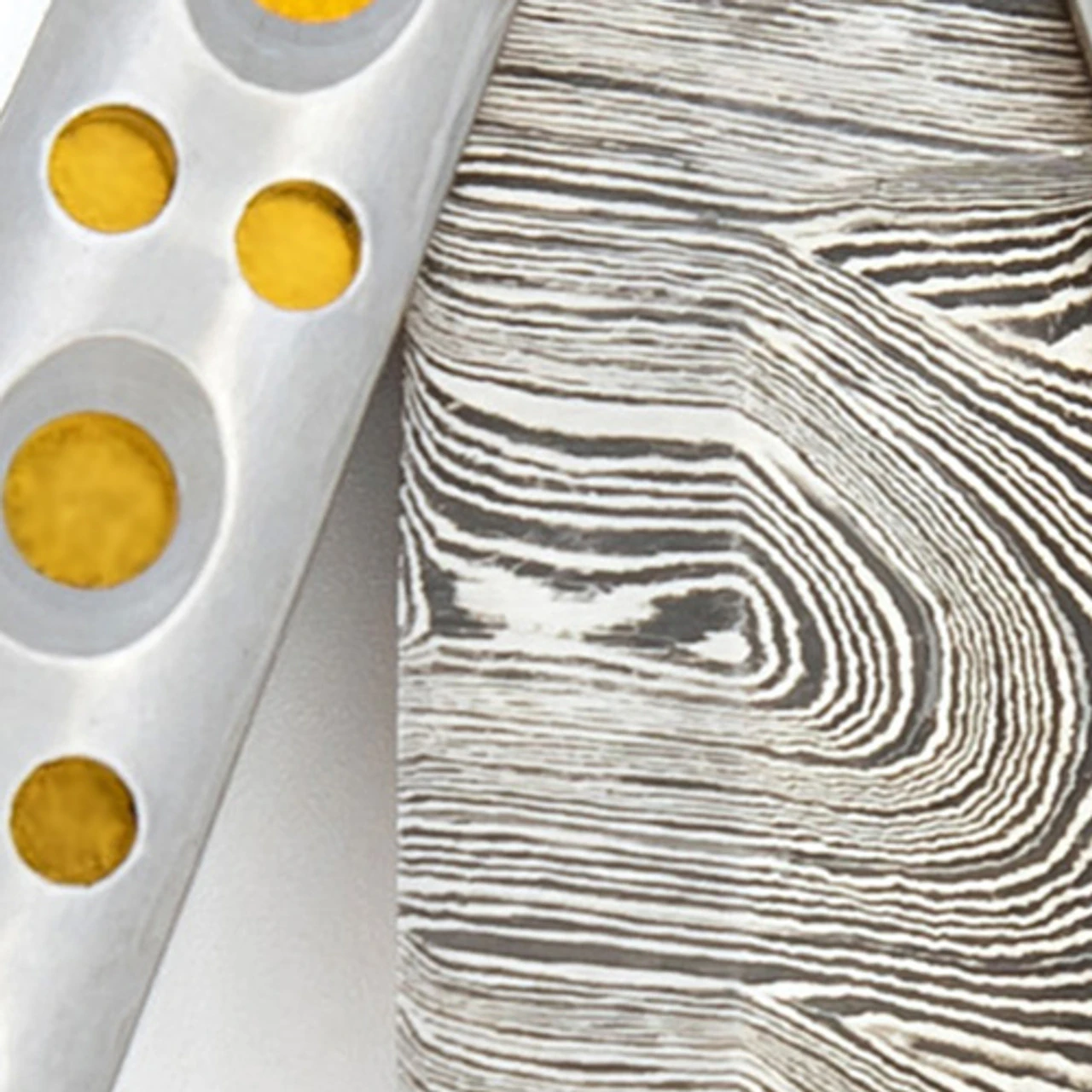 Anyone who has ever been gold panning in a river knows the rush of sifting through muck in search of shining gold pieces. No, it doesn’t sound very fun, but anyone who ever found gold while panning still has it in that little plastic tube somewhere. The Gold Panning Butterfly Knife has that exact inexplicable attitude. The handles are silver with large and small holes through them. What is interesting about this is that the frame underneath is gold colored so the flair in the Gold Panning is muted with small insurrections of color. The blade is in a drop point style constructed of Damascus steel which is durable and won’t lose an edge do quickly. The aluminum handles won’t fall behind either in terms of durability. The Gold Panning Butterfly Knife comes equipped with a lock connected to the base of the left handle. Simply close the knife and slide the lock into the right handle and the knife will stay closed. Overall Length: 9 Inches, Blade Length: 4.75 Inches