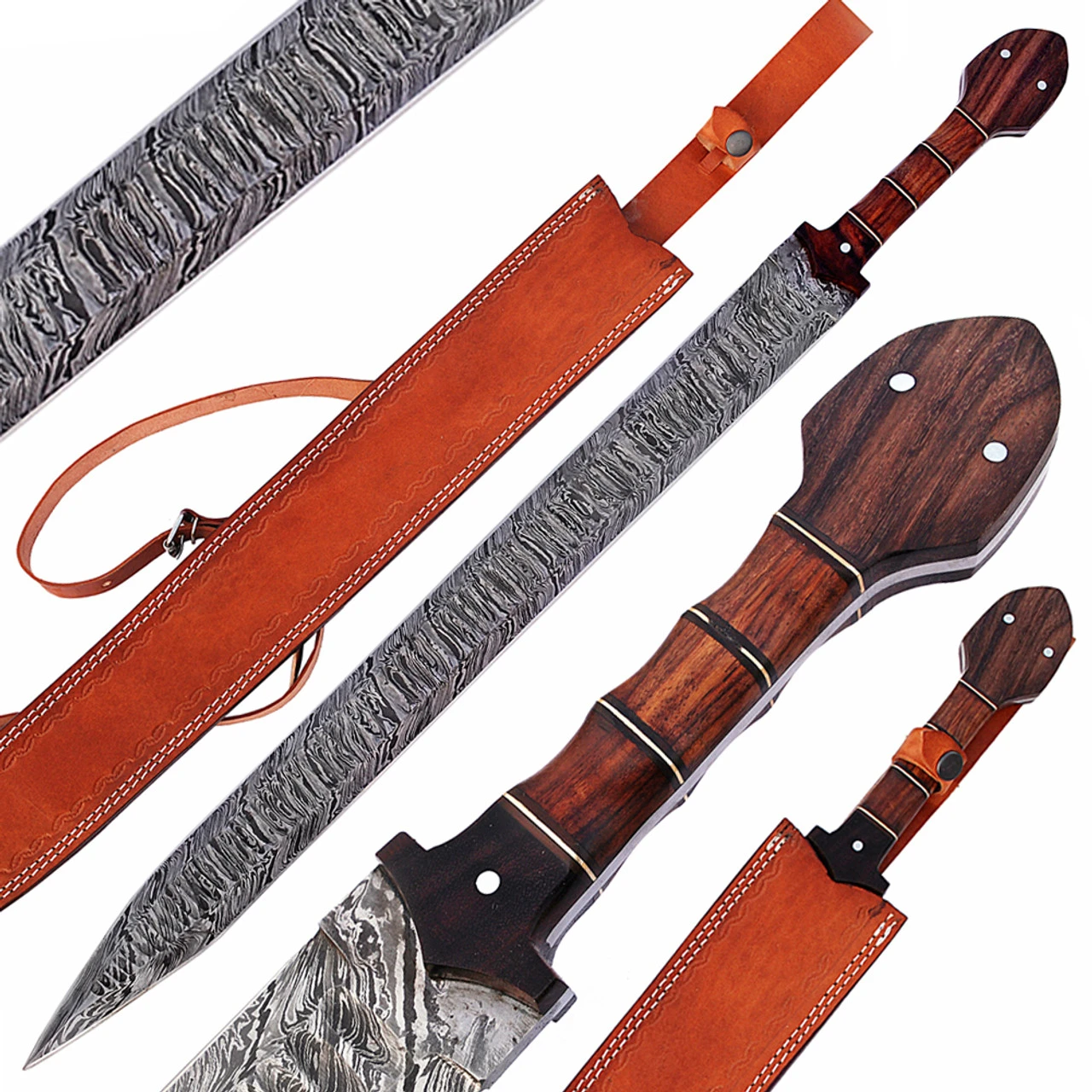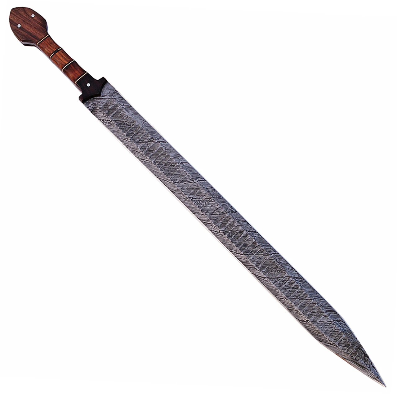 This sword gives a modern twist to a classic blade. Speaking of the blade, it is made from hand forged Damasus that consist of 1095/15n20 alloy steel made with a 176 blade layers and tempered around 54 to 55. The twist pattern really brings the blade to life with the flowing movement of the design. The parallel edges come sharp and ready for use. What is interesting about this blade is the unusual fuller. Instead of running vertical down the center, it is horizontal. Gouges were taken out almost the entire length of the blade. This superior weapon has a full tang construction and a handle to die for. I mean look at it! Segmented contoured sheesham has been stained and fitted to create this stunning handle. In between each segment it has two layers of teal stained wood with a brass spacer. Brass pins hold each segment in place. To carry your weapon with you we have included a premium leather sheath with back strap and belt loop. Overall Length: 27.75 Inches.