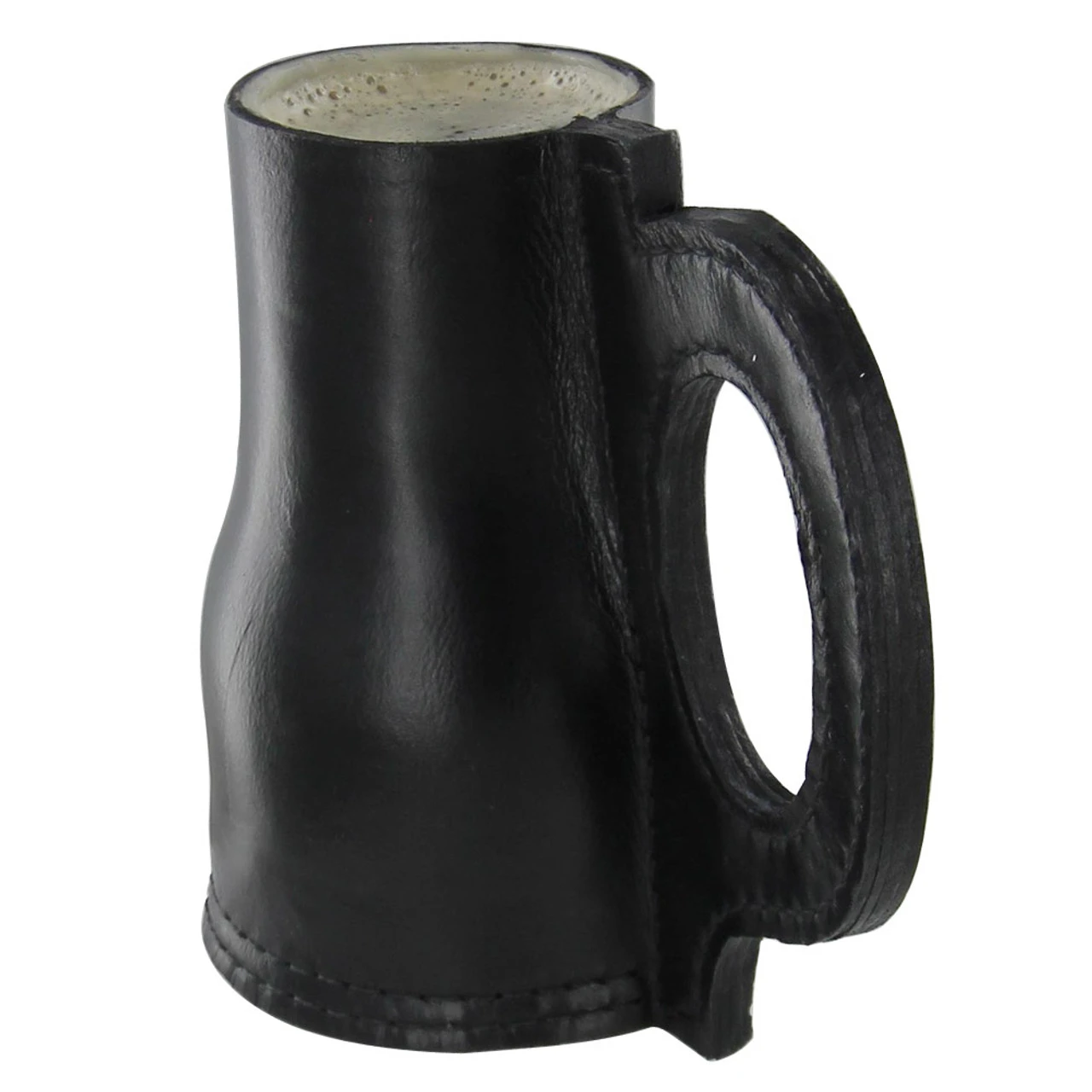 This tankard is tanned Jack leather and comes in black. The inside is made from beeswax. Due to the nature of beeswax only cold liquids should be poured in this tankard. It comes with a large leather handle and a rather large bottom. All the leather has been hand sewn.Overall Height: 6.62 Inches.