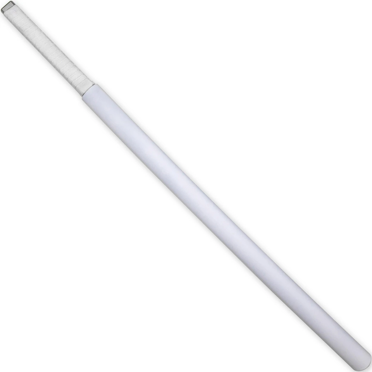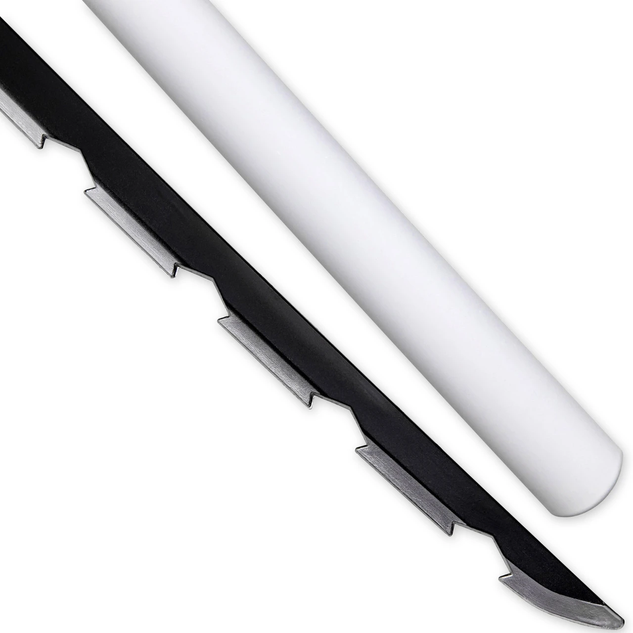 This full-size replica may be made of foam, but it is certainly no children’s toy. This modified Nichirin sword is composed of polyurethane foam and features a 10 mm fiberglass core. Polyurethane foam is both durable and flexible, and the added fiberglass core creates a strong sword that can be used for cosplay as well as kicking bad guy butt in mock battle. The base of the blade is a matte black and has a jagged edge with a silver Hamon. The handle is molded to resemble a cloth wrapping in white, and is topped by a painted silver pommel. Included with your purchase is solid matte white hard plastic scabbard to house your blades when not in use, though this will not be needed for the character since he does not use them. This lightweight prop is the perfect accessory to complete your cosplay and carry around your next convention. Overall Length: 39.5 inches, Blade Length: 29.5 inches