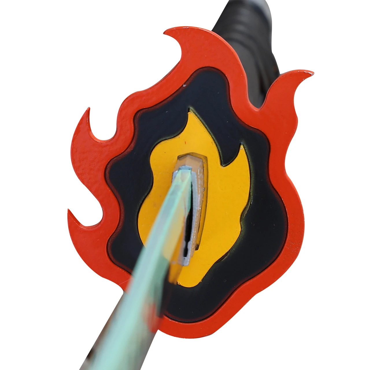 Being a demon slayer is a dangerous and unrelenting job. The kind of training and dedication required to become part of the Demon Slayer Corps could not be achieved without the assistance of a reliable Nichirin, which is the sword or weapon that is specially made for a demon slayer to kill demons. In the anime, the sword is forged from scarlet crimson iron and scarlet crimson ore, which are collected from the mountains. Though we may not be able to obtain these exact materials, we have nonetheless created a fierce katana for your anime collection. This replica katana is made to look just like the sword owned by Tanjiro Kamado, who unearths the 300-year-old blade from a battle doll later on in the series. The blade is constructed of high carbon steel with a factory edge. Etched along each side of the blade is a blue wave-like pattern which symbolizes the character’s ability. A red faux ray skin handle is wrapped meticulously with black faux leather in a traditional Japanese Style. The steel hand guard is made into a flame design with an orange outer edge and yellow core. Included with this beautiful collectible katana sword is a hard matte black scabbard to house your blade when not defeating demons. Overall Length: 38.25 inches, Blade Length: 27 inches