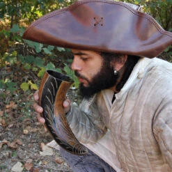 Brass Adorned Medieval Drinking Horn With Black Leather Holder