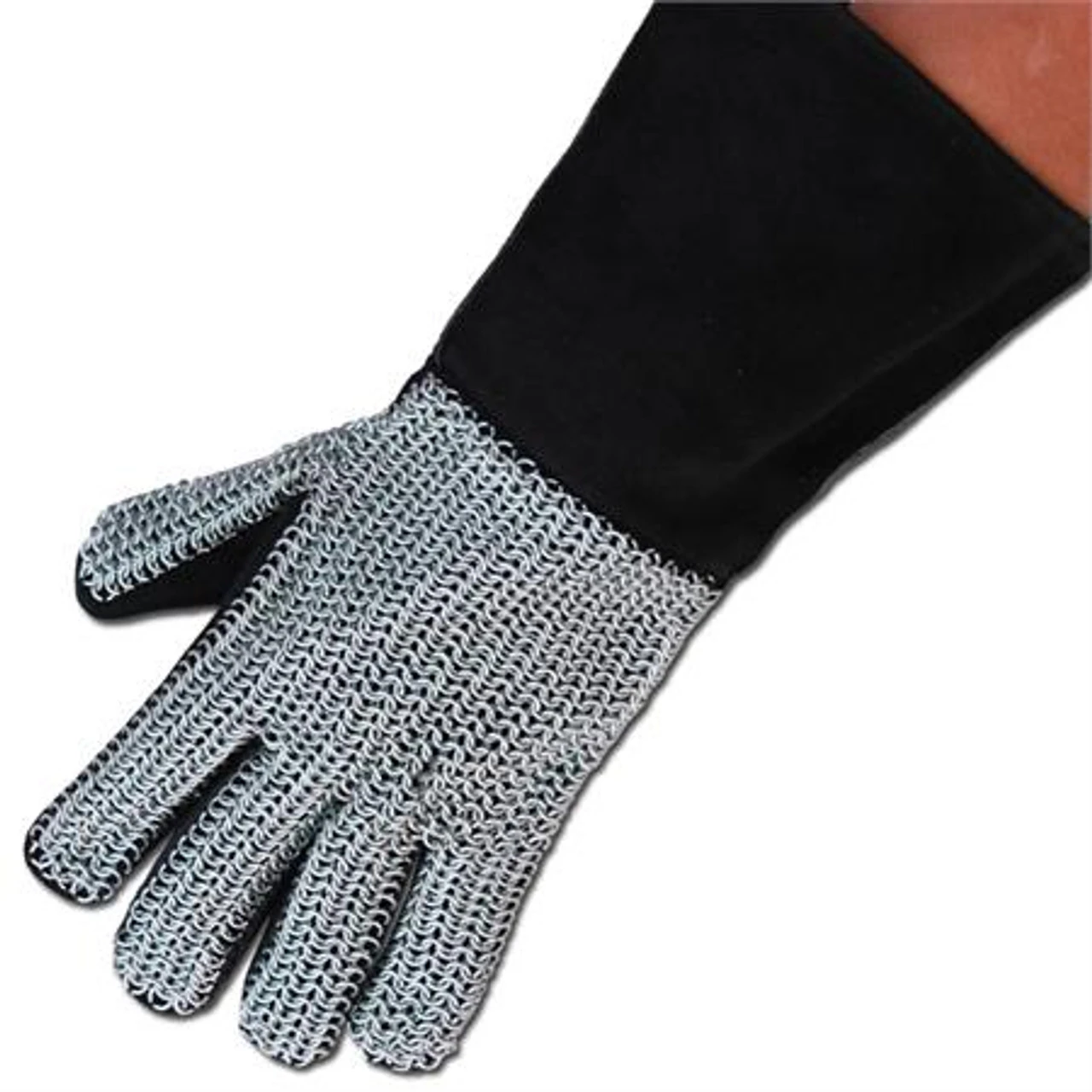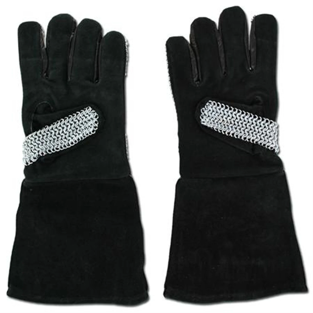 A combination of Suede and Chainmail makes this gloves a great piece for reenactment, cosplay or actual training. This affordable Suede Chainmail Glove Set has been remarkably mailed using medieval 4 in 1 weave. The Chainmail is then stitched onto the Suede Glove using medieval tactics. Because it is vertical and horizontal weaves, it makes this prized possession flexible to bend but yet sturdy enough not to break. It feels soft in your hands while it can pack a deadly punch. This set comes with the right and left hand glove. Overall length 14.25 inch