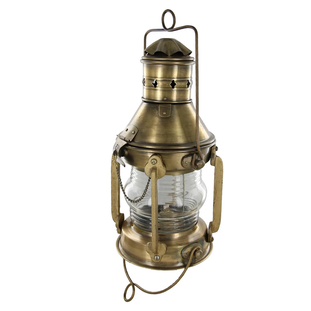 This lamp is made from brass with an antique finish to give the piece a look of age. The glass globe has a Fresnal design and is clear to give off a bright white light. This lantern features top and bottom handles for securing it in place. The top opens to take in and out the burn assembly. To lock the top an S hook is provided and attached with a small chain. The oil burning pot sits down right inside the globe and has an adjustable wick. An extra wicked is included with this lantern. The top of this lantern has decorative cutouts to let in oxygen and vent the lantern. Dont just think this lantern can be used for nautical purposes. It would look great outside a cabin or a rustic decorative accent. Plus if the power goes out you are already prepared.Overall Length: 13 Inches.