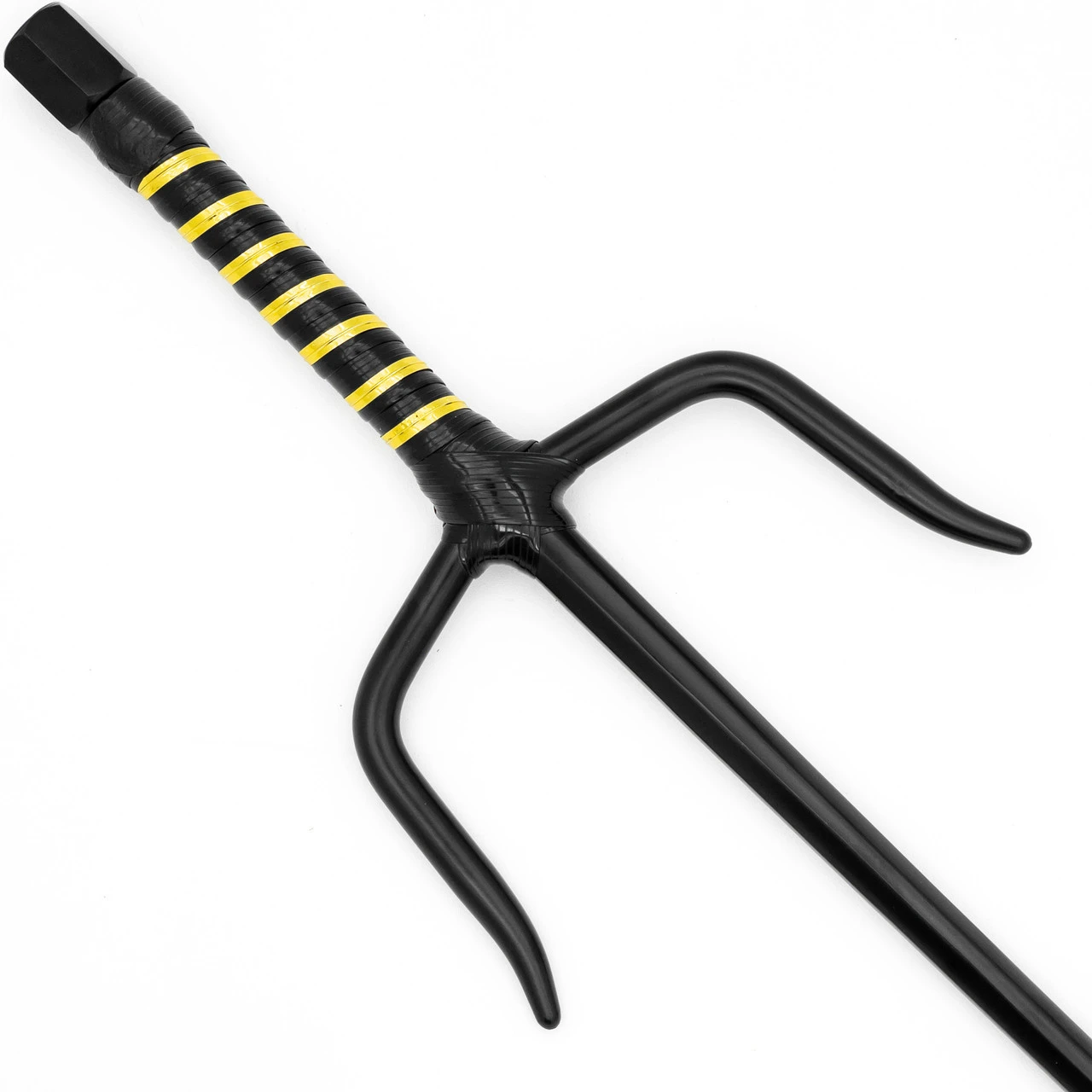 The Moonlit Demonstration Octagonal Sai Pair is a pair of octagonal sai composed of stainless steel with a black anodized finish. The sai feature the trademark three prongs and this set is full tang. The handles are stainless steel with a wrap composed of plastic with metal thread. The wrap is black, matching the blade, however it also features a thick gold line that spirals up the handle adding the perfect splash of color to these sai. The weight on these sai is 1.6 lbs. so these are not necessarily just for practice. These Moonlit Demonstration Octagonal Sai are perfect for a beginner since they aren’t sharp, an intermediate trainer who is getting used to the weight, or a pro martial artist who needs a set for a demonstration. Overall Length: 21 Inches. Weight: 3.6 lbs.