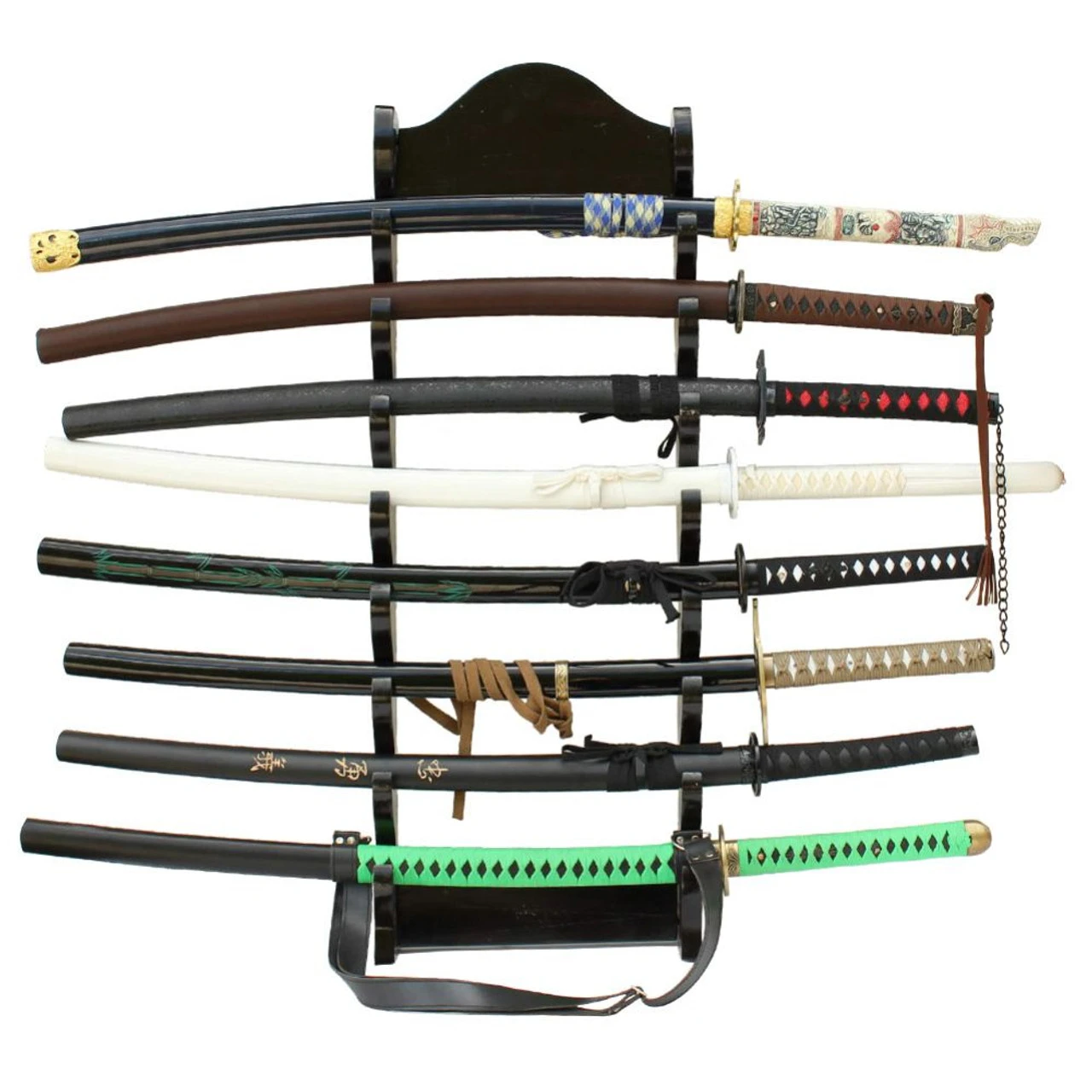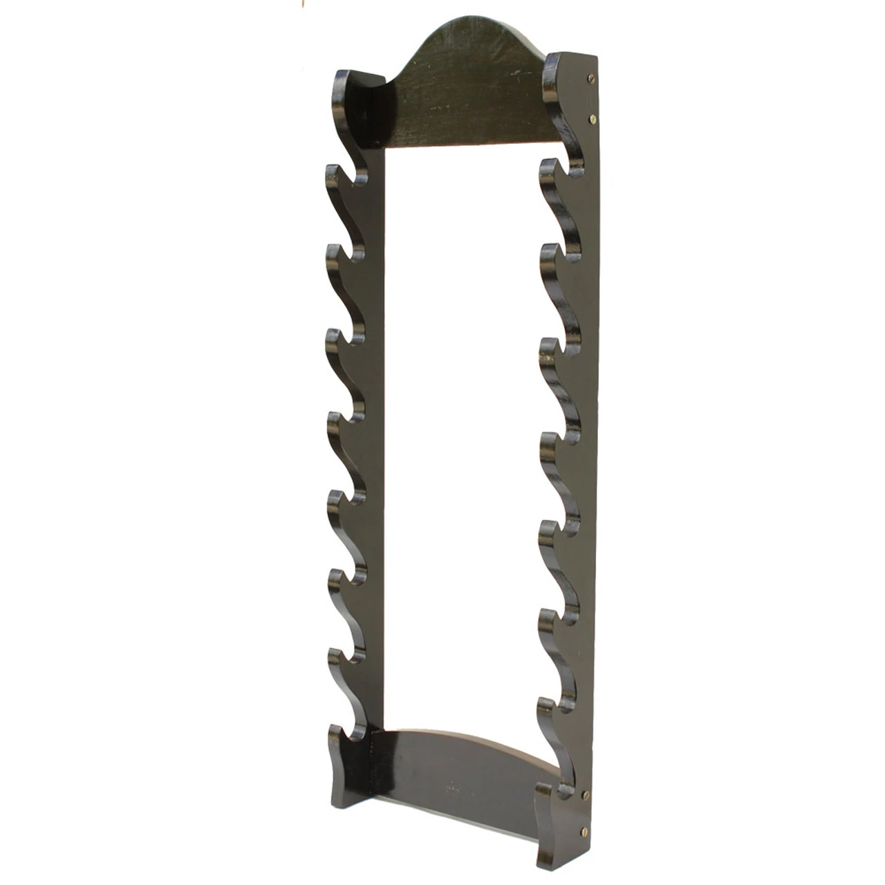 Unlike most sword racks that are made of press board our Premium Eight Tier Solid Wall Sword Display is constructed of high quality solid mango wood making it extremely durable and long lasting. Mango wood is a densely grained hardwood with a strong structure: this makes it perfect for constructing products such as chairs and other framed items where weight-based stresses are applied frequently and in unpredictable ways. This wall stand is space saving since it is able to be wall mounted and can be assembled out of the box and mounted on the wall in a matter of minutes. This sword stand holds eight single Katana, Wakisashi, or other swords in a horizontal position. Don’t leave your swords lying around collecting dust display their individual uniqueness!