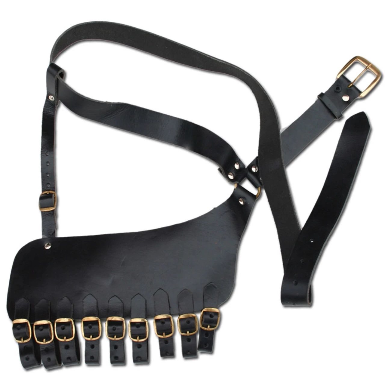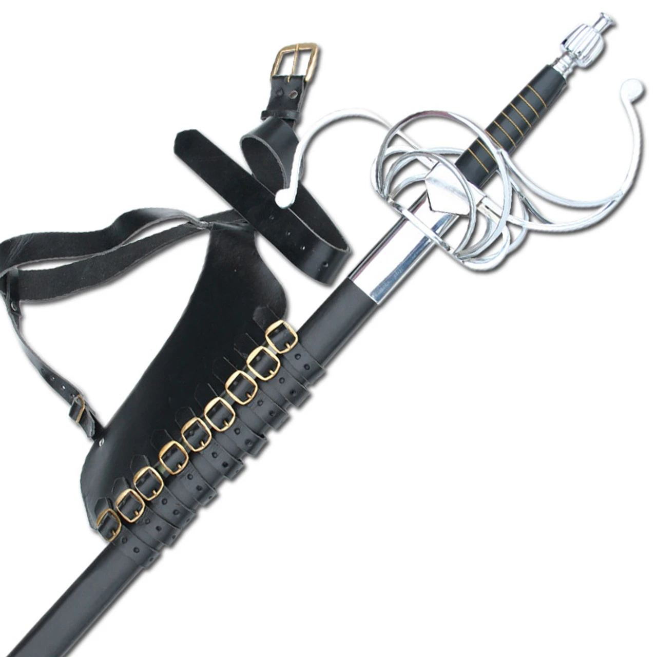 Hand crafted from the finest quality leather, our Right Hand Rapier belt has been designed in two pieces which ensures that no matter who wears the belt, the carrier still hangs at the proper angle. The rapier scabbard fits through leather loops in the carrier at the best angle for quick access. Dont be afraid that your scabbard will fall through because it has 9 loops with up to 5 adjustable holes. It is riveted together and offers brass fittings and rings. The thickness on this Right Hand Leather Sword Rapier is 2.50mm. Can fit a waist size: 47inches-53 inches.