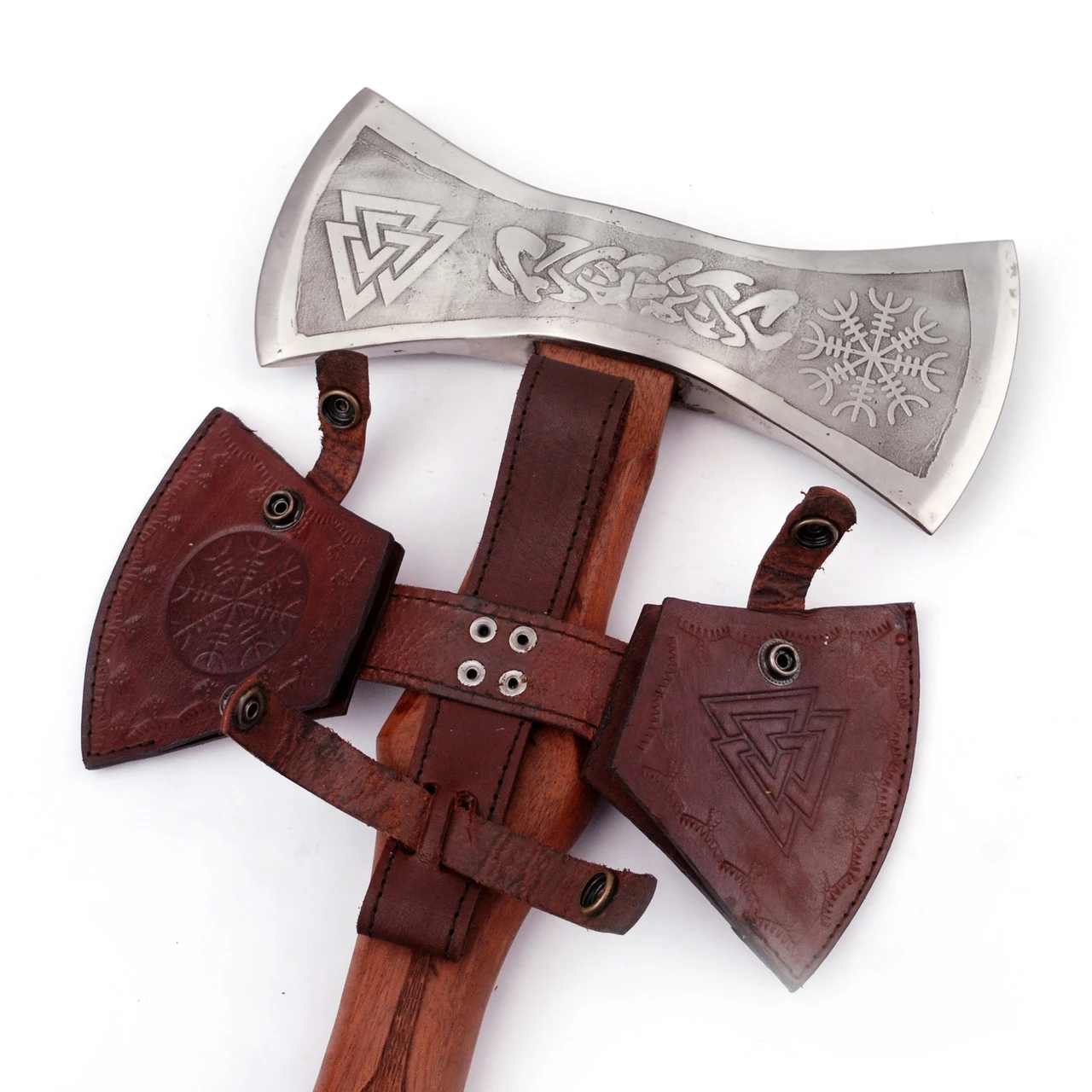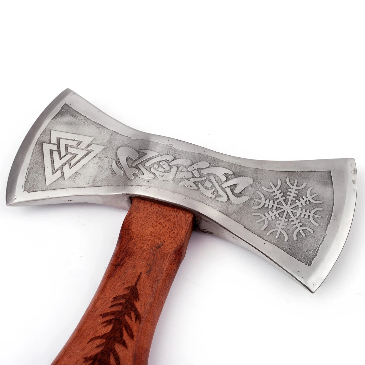The fun has begun, and you are more than prepared with our hand forged double-bitted axe by your side. The cast carbon steel head features a standard sharpening. Engraved on both sides of the head of this collectible axe is the magical Icelandic stave known in Viking culture as the vegvísir, so the warrior wielding this axe will always find their way to victory, and the slain warriors knot, valknut, as a reminder of those who were not so lucky. On the center of each side of the head is engraved Norse symbols. The handle is made from durable sheesham wood that is contoured for a nice grip, and stained a rich warm brown. Etched onto the handle right below the blade is Yggdrasil better known as the tree of life. Genuine bovine leather cord wraps the bottom of the handle. Overall Length: 28.5 Inches, Blade Length: 3.75 Inches