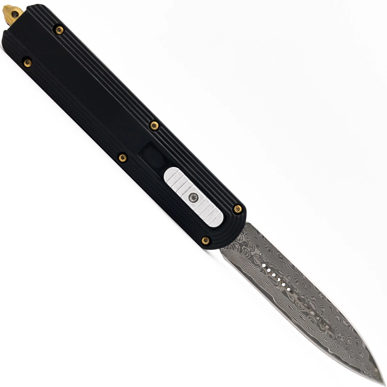 This magnificent automatic knife is equipped with a powerful dual action function, meaning all you need to do is push the thumb slide located on the top of the knife, back and forth to eject and retract the blade. It is amazing to see the blade propelled forward in one quick motion and then back again. The spear point blade is made from Damascus steel with a gorgeous wave pattern. The handle casing is zinc alloy with decorative beveled line running around the edge. Gold hardware looks stunning against the all-black handle, including a glass breaker featured on the end in case of emergency. Included with this knife is a FREE black nylon sheath complete with a belt loop for easy carry. Overall Length: 9.25 inch, Blade Length: 3.75 inch