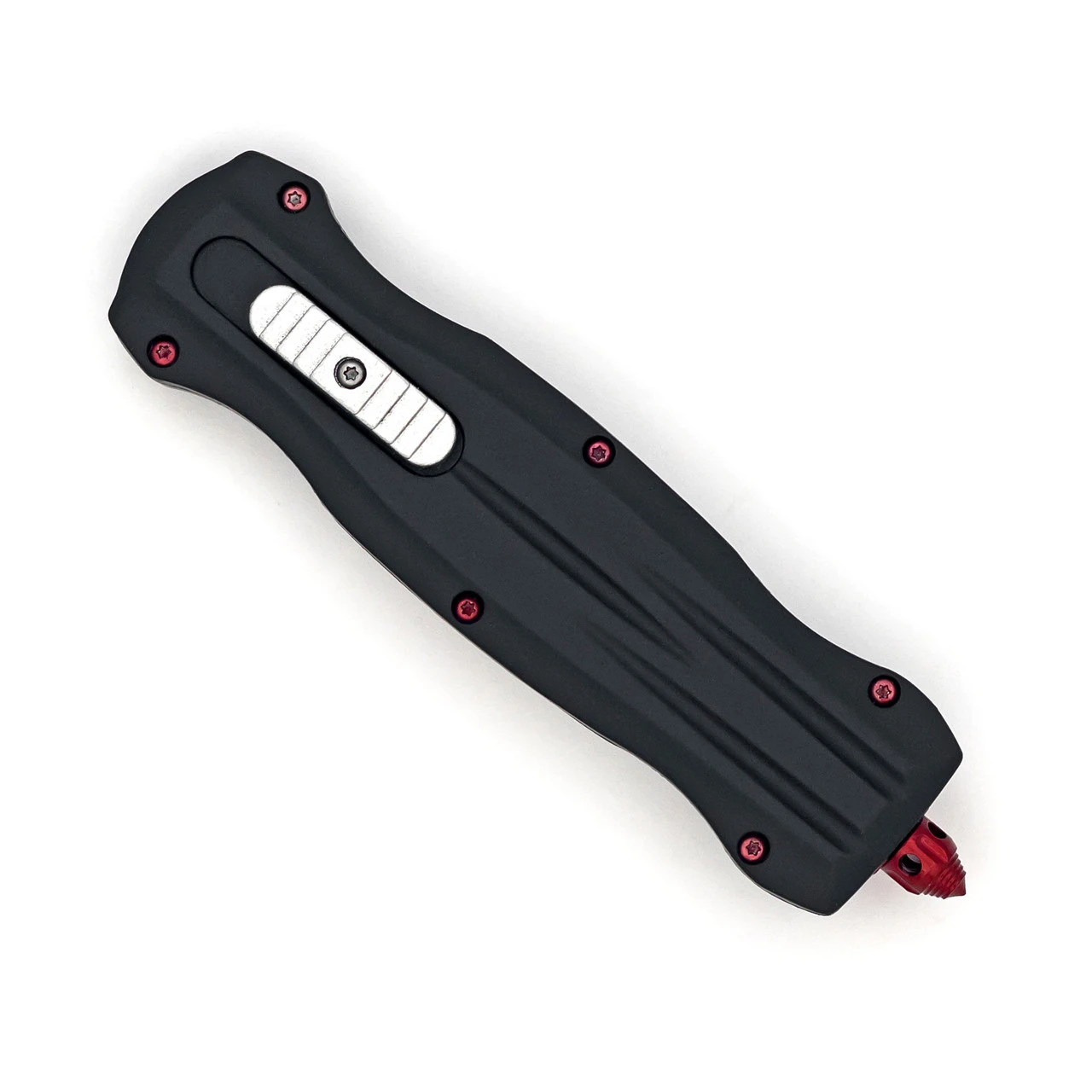 The Splash Zone Automatic OTF Knife is an out the front knife with a contoured aluminum handle and red stainless-steel blade. The switch to deploy the blade is in the center of the handle as opposed to the side. This means that it is easier to deploy the blade with one hand. The blade itself is a deep crimson shot through with tens of curves creating a lattice of texture along the blade face. There is a fuller in the center of the blade with hole cutouts to reduce weight and provide balance. The smaller details are always the showstoppers, aren’t they? Not only is the blade on this beauty a deep red in contrast to the matte black handle, the screws themselves that are in the handle are red as well. This tiny detail enhances the design and elevates it to something truly breathtaking. Careful though, the first three rows are the splash zone. Overall Length: 9 Inches, Blade Length: 3.75 Inches