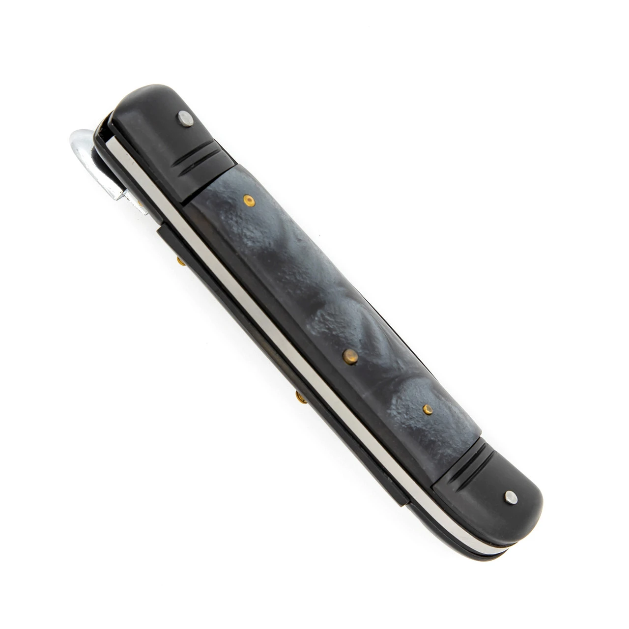 The stars scattered against the pitch-black expanse of freezing space are mirrored in the pearly black handle of the Splayed Stars Lever Lock Knife. The blade on this knife is black anodized stainless steel and the hardware matches so this knife is fully blacked-out, resulting in a cool and mysterious look. This knife is an automatic knife with a lever lock mechanism which means that there is a lever on the bolster. If this lever is pressed down then the blade will deploy, swinging out of the left side of the handle. You press the lever down again to unlock the blade so you can guide it back into the handle to close it. If you flip the lever up then the blade cannot deploy. For even safer carry and storage, the Splayed Stars Lever Lock Knife comes with its own black nylon sheath with a belt loop. Overall Length: 8 Inches, Blade Length: 3.5 Inches