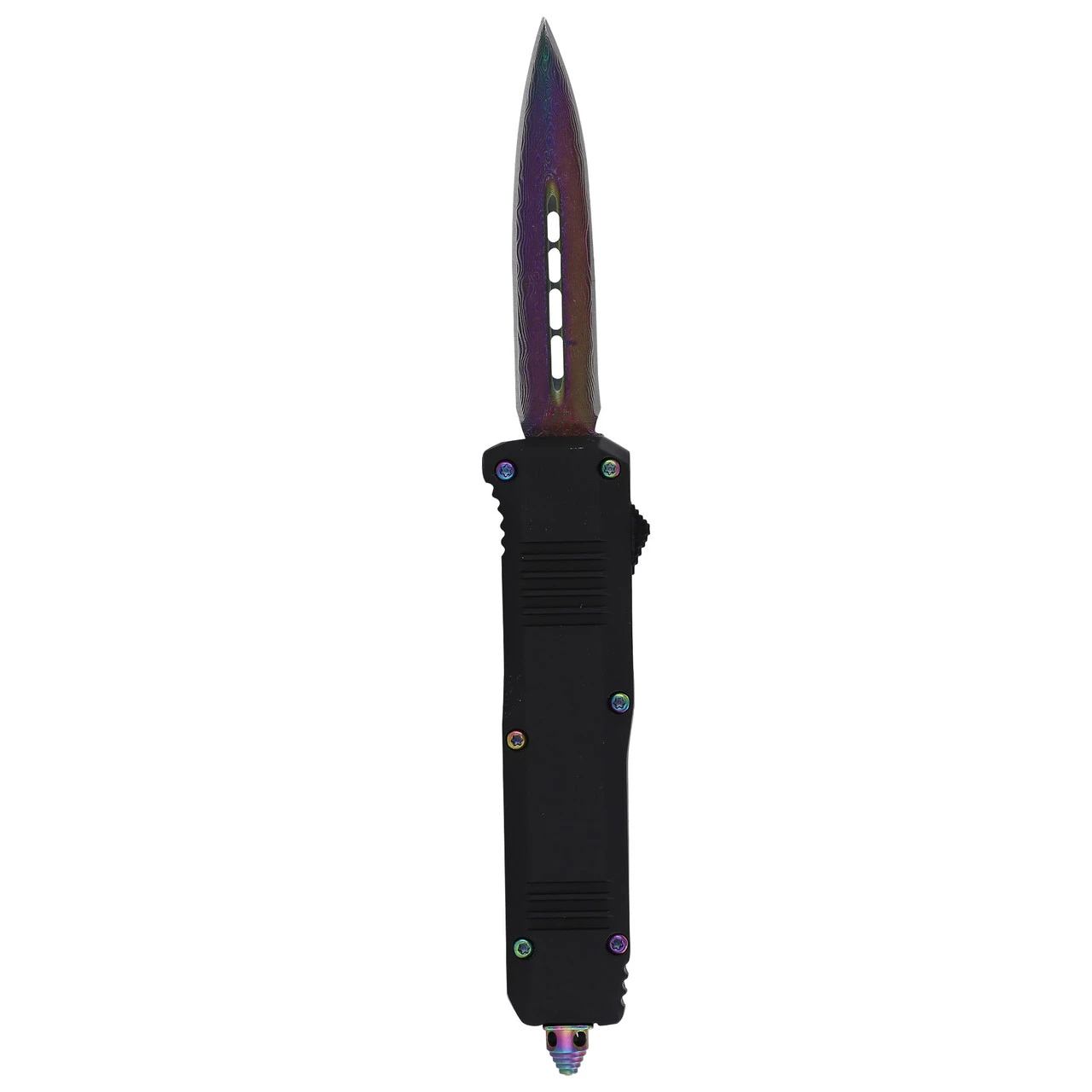 This knife has all of the power of a regular Out the Front knife, now in a miniature size! The blade is forged out of 1095/15N20 Damascus steel that has been folded over and over approximately 176-180 times to give it that beautiful and unique wave-like pattern. This steel has a Rockwell rating of 54-56. The blade is formed into a spear point style and has been heat treated to present a gorgeous titanium rainbow finish. The matte black handle casing is made from a durable zinc aluminum alloy. the blade of this dual-action automatic knife can be ejected and retracted using the switch located on the side of the handle. The handle also comes equipped with a rainbow titanium pocket clip and glass breaker in case of emergencies. Included with your knife is a black sheath with snap closure and belt loop so you can conveniently carry it anywhere. Overall Length: 7, Blade Length: 2.75 inches